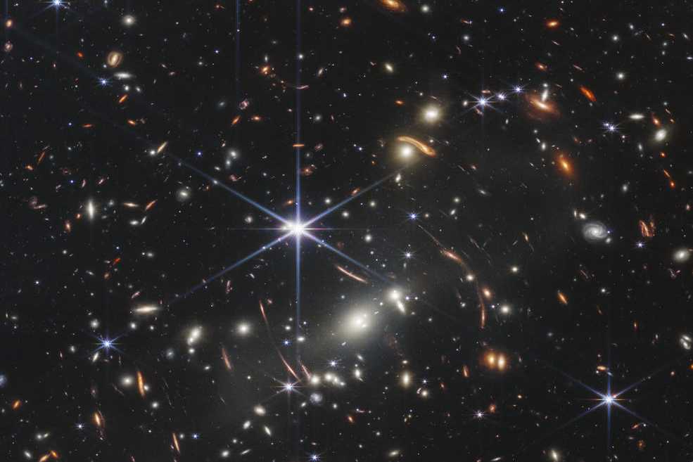 Η εικόνα δείχνει το SMACS 0723, όπου μια τεράστια ομάδα σμήνων γαλαξιών λειτουργεί ως μεγεθυντικός φακός για τα αντικείμενα πίσω τους. Ονομάζεται βαρυτικός φακός, και είναι αυτός που δημιούργησε την πρώτη βαθιά όψη πεδίου του Webb με απίστευτα παλιούς και μακρινούς γαλαξίες.